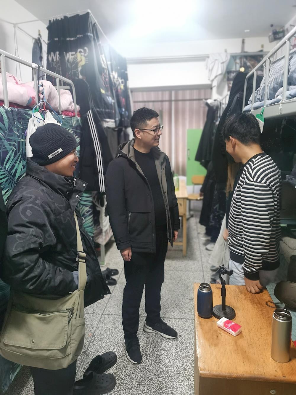 活动当天,党员教师们分组走访了各年级的员工寝室。每到一个寝室,老师们都仔细查看寝室卫生状况、用电安全以及物品摆放等情况,并与员工亲切交谈。在交谈过程中,党员教师们不仅关心员工的学习情况,询问课程进展、学业压力以及学习计划,还深入了解员工的生活日常,包括饮食起居、人际关系等方面,鼓励员工们养成良好的生活习惯,营造和谐融洽的寝室氛围。